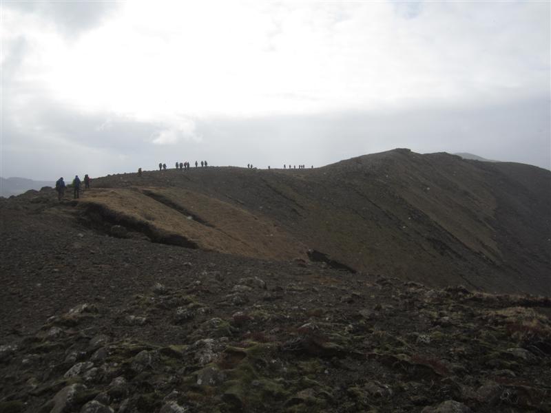 Sjá ofan af tagli Gráfells til baka á hópinn að tínast inn...