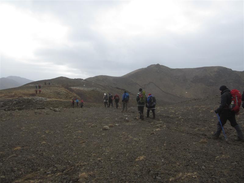 Litið til baka með Gráfellið í fjarska og Rauðöldur og Rauðölduhnúk fjær en Hekla hvarf endanlega í skýin eftir því sem leið á daginn í stað þess að birtast með heiðari himni eins og ætlunin var nú skv. veðurkortunu... eins gott að það var ekki betra veður á Snæfellsnesi þennan dag þar sem við færðum þessa göngu um mánuð út af slæmri veðurspá á nesinu... þjálfarar gáðu ekki einu sinni til að svekkja sig ekki að óþörfu... ;-)
