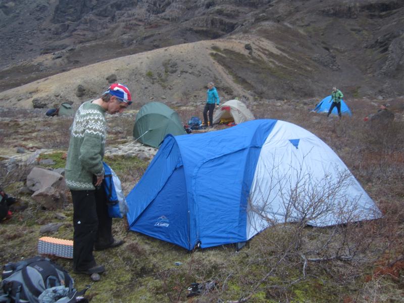 Skyndilega sáum við glitta í græn tjöld hinum megin Kjósarmynnisins... við vorum að lenda...