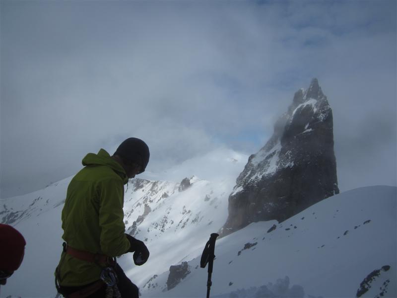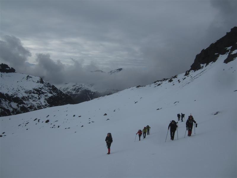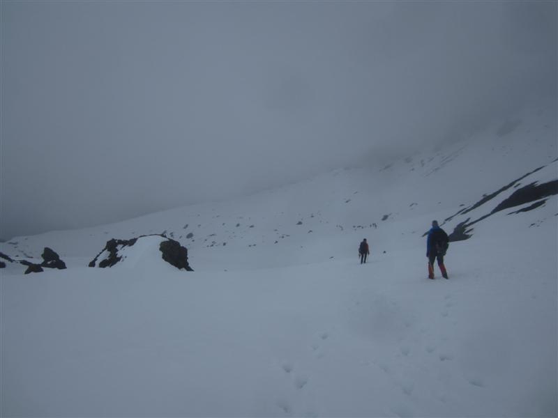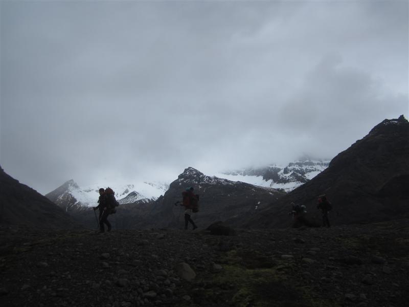 Vestara Meingil framundan vinstra megin og Miðfellið sjálft sem við ætluðum að ganga upp á, á morgun framundan en Miðfellstindur sjálfur í skýjunum... en það munaði ekki miklu eins og reyndin varð alla helgina...