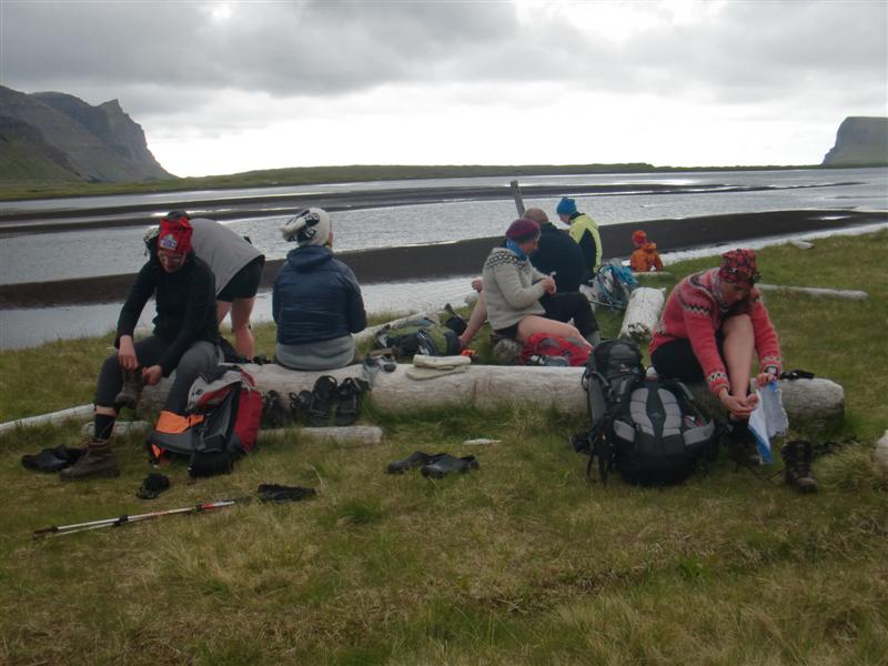 Sylvía og Soffía Rósa komnar í regngallann... en þær eins og fleiri héldu uppi gleðinni óslitið frá upphafi til enda en líklega má segja að gleðin sé mikilvægasti búnaðurinn á Hornströndum þar sem allt getur gerst og ferðaplön eru endanlega algerlega á valdi veðurs og færðar...