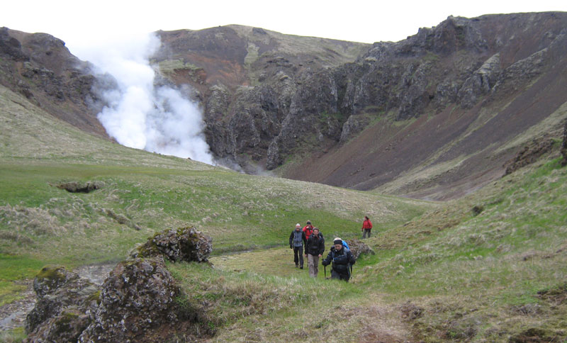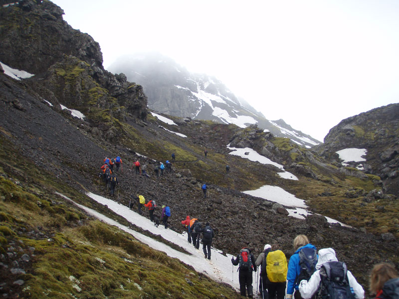 Sjá göngumenn fyrir miðri mynd í bröttum brekkunum en góðum mosa og haldgóðum klettum sem gáfu góða leið til að klöngrast þarna yfir um... engin furða að menn finni þetta ekki þegar nær dregur... hægt að þrælast heilmikið þarna um í leit að smugu... Færið varla orðið gott, enda tóku þjálfara með sér ísaxir til öryggis ef höggva þyrfti spor í harða snjóskafla sem gjarnan sitja þrjóskastir eftir fram á sumarið... Harður