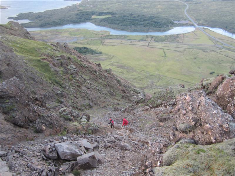 ... enda voru þeir í spólandi banastuði og fóru opnu geilina sem hér sést í stuðlaberginu upp á tindinn með tilhneyrandi grjóthruni... á meðan Örninn leiddi hópinn upp norðan megin aðeins rólegri leið...