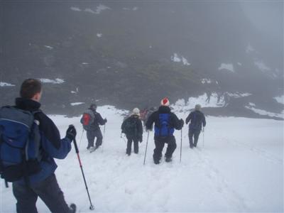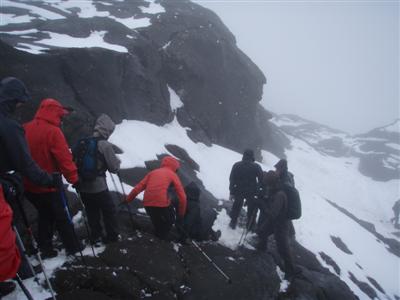 Færið var gott, snjórinn blautur og leiðin að mörgu leyti greiðfærari með snjónum en rigningin rann stríðum straumum og við vorum öll meira og minna blaut þegar tindurinn nálgaðist... og ekkert útsýni...