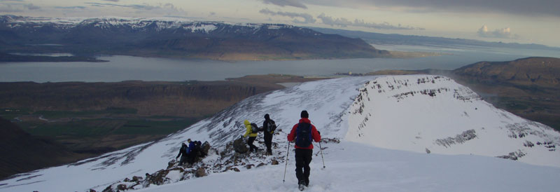 með fleiri tindum Hafnarfjallssvæðisins Jú, jú, allir ætluðu alla leið á hnúkinn... þá Hvannadalshnúk eftir tvær vikur..? ... umræðan snerist að mestu um hann í þessari göngu... en nei, hér er átt við hæsta tind Hafnarfjalls... Farið var upp kletta Gildalshnúks og gegnum hoggin snjóspor Arnarins og brátt vorum við umvafin hnúkum svæðisins með stórkostlegu útsýni svo ekki sé meira sagt yfir á tvo stærstu fjallgarða Suðvesturhornsins Skarðsheiðarinnar og Esjunnar að ónefndum tindum Hafnarfjallssvæðisins næst okkur.
