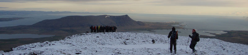 En... þau fáu sem mættu gáfu sig ekki og vildu klára gönguna alla leið upp á Þúfurnar í 600 m hæð þrátt fyrir erfiðan mótvind. Menn steinlágu í verstu hviðunum og skriðu svo af stað þess á milli... þetta fer að vera vani hjá hópnum... og við náðum upp á Þúfurnar eftir 3,3 km göngu og 1:43 klst. barning við bálhvassan vindinn beint í fangið...