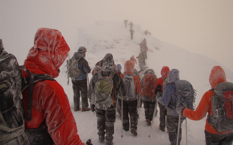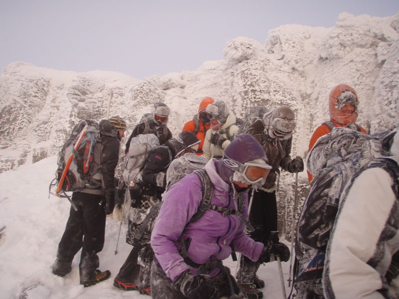Á hæsta tindi dagsins, Miðkambi í 1.026 m hæð, léttri snjóþoku, kulda og litlu skyggni... Miðkambur er nafngift þjálfara og næst austasta "torg" Skarðsheiðarhryggjarins en vestar eru "Skessukambur" og svo "Skarðskambur" sem einnig eru nafnlausir á kortum en svipmiklir tindar á Skarðsheiðinni sem við teljum að megi hafa nafn og hafa ofangreind verið notuð innan hópsins í fyrri göngum hans.