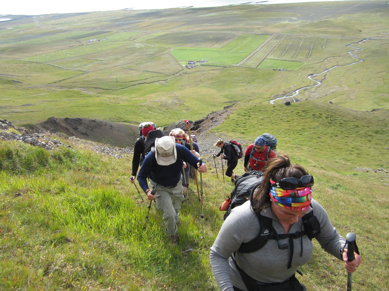 Erfiðasti hjallinn á leiðinni á Helgrindur er fyrsta brekkan upp á hálendið ofan bæjarins...