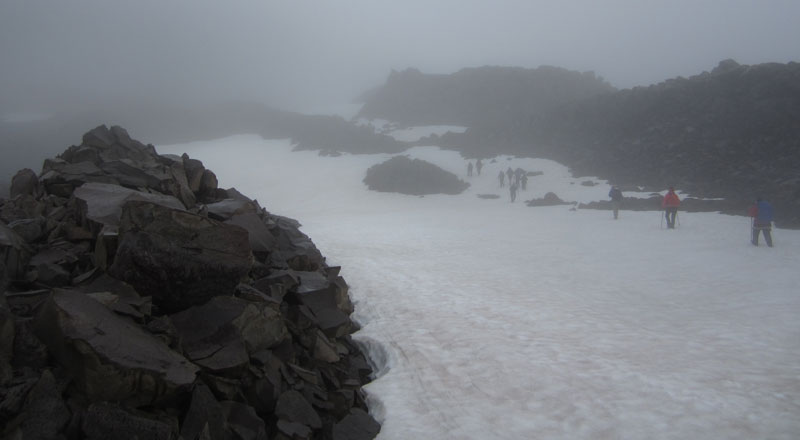 Hér fór að greiðast mikið úr hópnum en allir sameinaðir í skarðinu þarna ofan skaflsins úr því þokan var enn við lýði...