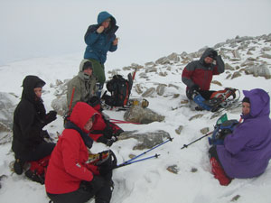 .Pása og umræður við fjallsræturnar. Brattar hlíðar Baulu að baki bæði upp og niður Eftir var kaflinn að bílunum yfir snævi þakta hóla og hæðir. |